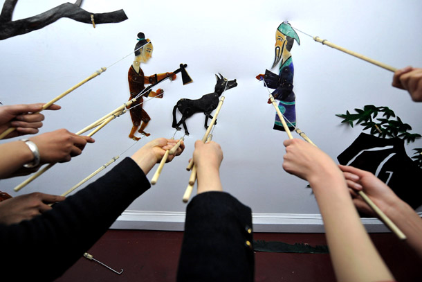 2011年3月12日,在孝义文化产业皮影基地,皮影戏艺人在表演皮影戏《东郭与狼》