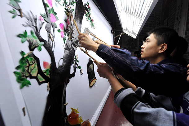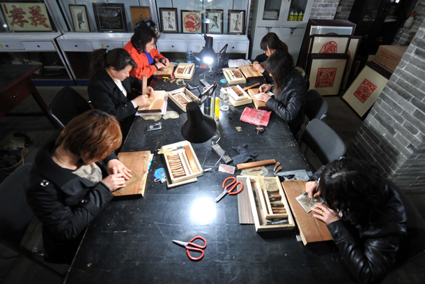 3月12日,在孝义文化产业皮影基地,皮影戏艺人在制作皮影 |