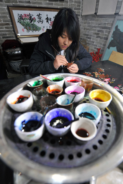 皮影戏艺人在给皮影上色