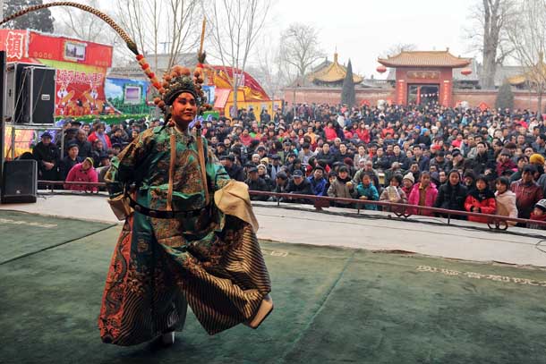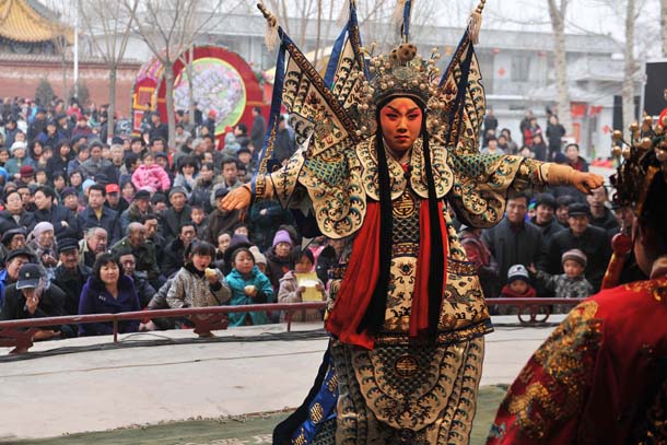 2011年2月18日,在太原市阳曲县大盂镇棘针沟村,太原市实际晋剧院的演员们在表演晋剧折子戏