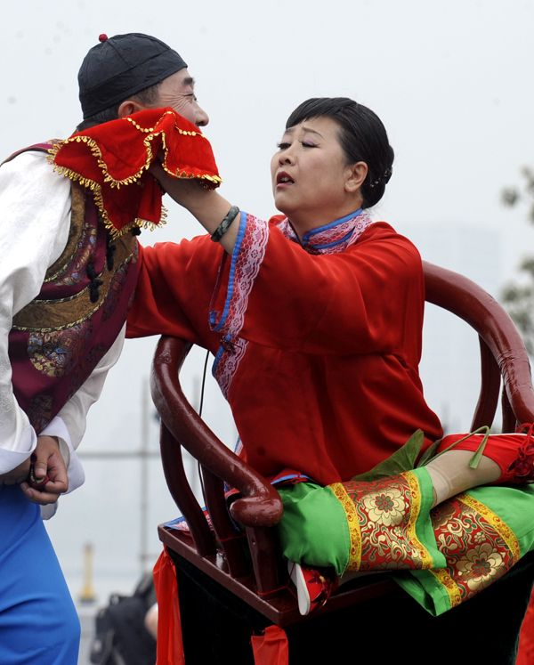 5月20日,山西省孝义市的两位民间演员在世博园庆典广场表演秧歌《回娘家》。两位演员极具地方特色的精彩表演赢得了观众的喝彩。