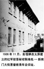 彭雪枫到太原后,由南汉宸陪同与阎锡山会晤,递交了毛泽东的亲笔信。阎锡山看信后,再联系到日本人和蒋介石对他构成的威胁,决计联共“守土抗日”,当然他的内心是要同时达到“用共产党的办法削弱共产党”的目的,这是后话。阎锡山当即指定其外甥、政训处主任梁化之为全权代表与彭雪枫磋商有关事宜。为避开蒋介石与日本人的耳目,阎锡山采取了极为保密措施,令梁化之与彭雪枫单线联系。后经双方商定:(1)红军在太原建立秘密机构;(2)彭雪枫与中共中央的通讯联络交通由阎方签发护照,保证安全;(3)空中联络在建立电台前,先使用阎方电台。联络站办公地址确定在首义门内“基督教青年会”后院6号。联络站安全问题由梁化之向太原市公安局打招呼。“基督教青年会”属教会机构,一般不会有人骚扰。但彭雪枫还是使用化名涂秀根,中共在太原的秘密联络工作便从此开始。