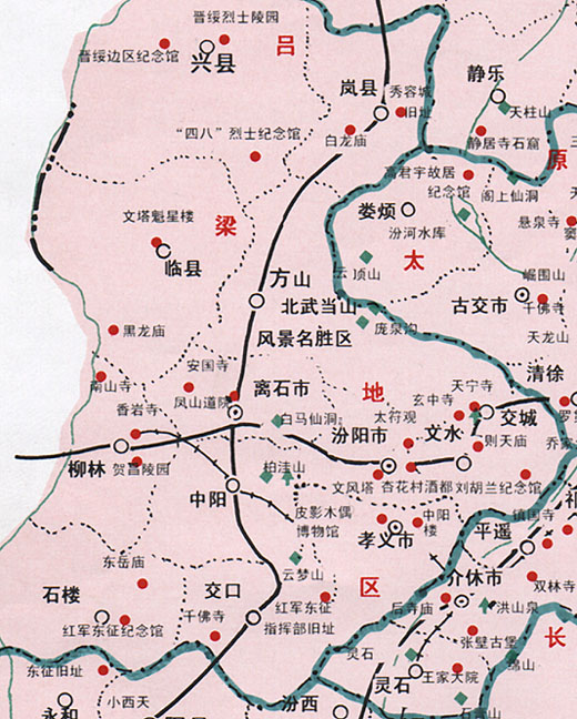 柏窳山:位于中阳县城东五公里处,峰峦峭拔,松柏叠翠。山腰有金代创建的道教庙宇——龙泉观。庙堂依山而筑,布局严谨,结构精巧。庙中有清冽甘醇的“龙泉水”。相传农历三月十七为圣母生日,这里届时举办庙会,游人香客云集山巅,汲取龙泉圣水,观赏柏窳胜景。另有傅山隐居此地的“方石山房”,其间留有题词真迹。