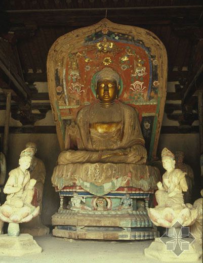 大殿内有一座佛坛,长八点四米,宽六点三米,高零点七米。坛上有唐代彩塑十七尊,非常珍贵。双腿盘坐的释迦牟尼佛像居中,文殊菩萨、普贤菩萨分列左右,天王、金刚矫健有力,童子赤足立地,形象都很生动。佛坛四周,满刻精美的花纹、莲瓣,这是唐代砖雕艺术的珍品。