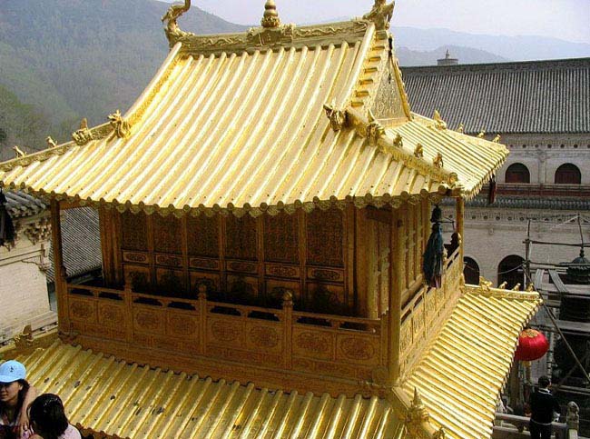 铜殿和铜塔,也是全国罕见的文物。铜殿高八点三米,宽四点七米,深四点五米,是明朝万历年间用铜十万斤铸成的。殿内四壁铸满了佛像,号称万佛;铜殿隔扇的外壁,铸有各种图案和花卉鸟兽,如玉兔拜月、丹凤朝阳、二龙戏珠等,非常精致。铜殿前原有铜塔五座,暗含五台之意,现仅留下两座,八面十三层,玲珑秀丽,引人注目。