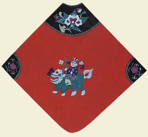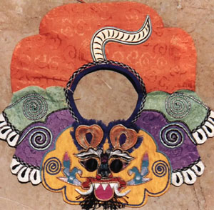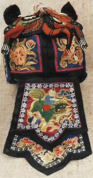 (因女孩都留发,戴的时间长了易出汗发热)。这种帽子一般是母亲传给女儿的传家宝,出嫁时就带到了婆家,再传给女儿……另外还有一种专为一岁以内不会说话的小孩缝制的虎头小凉帽,设计很巧妙,既保护了前脑门,头又不觉热,虎面的两侧还带有两条前腿,虎面底都用红色布料将对称两片从弧形边连接缝在一起,缝绣上五官,桃形耳是尖向下用小布条缝制连在两眼偏后的上方,再点缀睫毛、胡须,牙齿外露但观之不凶,周围滚缝一窄边,再将小白爪分别缝在两前腿的末端,再在帽的前沿点缀上带串珠的流苏,后边用一寸宽的色布条连接成和小孩头大小一样的圆圈,就制成了头顶露在外的非常漂亮适用的小凉帽。