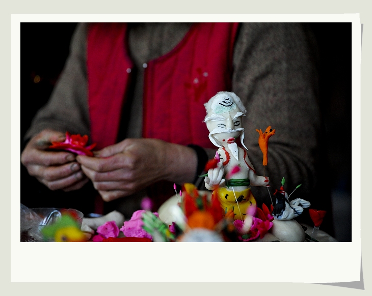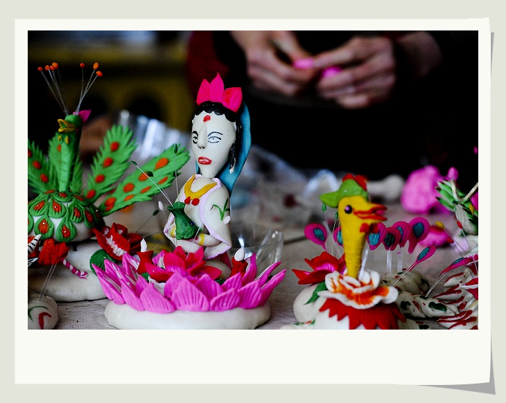面塑品除制作原料的处理工艺上考究外,在捏、剪、割、揉、夹、压、盘、叠、镶、嵌、组合、压纹、纹花、色调配制也极其讲究。