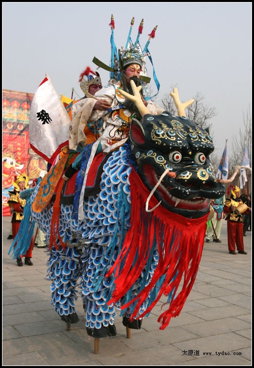 山西省稷山县清河镇阳城村民间艺术表演队来到运城市盐湖区舜帝陵景区,为市民表演民间社火“高跷走兽”,吸引了众多市民观看。