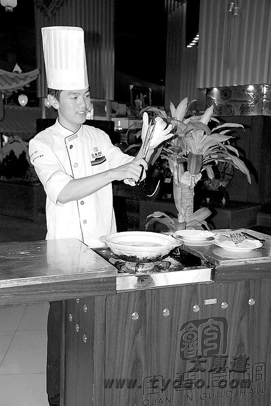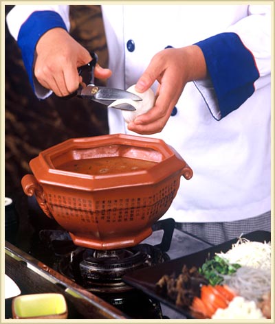 今天剪刀面在酒店多借鉴扒房现做之法,改为堂做,可达到一观二品的目的,以全晋会馆和晋韵楼等名店为代表。剪刀面之面,和时加盐少许,和好略硬须饧。汤分浓淡,提前备好,而后上火煮沸,持面以剪。剪时左手持面,右手握剪,面剪不离,声如鹊鸟归巢之喧,形如银鱼入水之跃,高手每分钟可剪出200余根,令人目不暇接。煮时稍闷,盛碗上桌,讲究配四味碟、四菜码,伴此“焉得并州快剪刀,剪取吴淞半江水”之情之趣,就可含英咀华,食乐无穷了。剪刀面现在还被用作表演艺术,全晋会馆将民俗艺术融入,创制的高跷系列面食表演中,就有高跷剪刀面。舞中靓妹,脚踩高跷登台,亭亭玉立,持面握剪,面鱼便在高高的空间里飘落,如春风拂柳、秋瀑激雪,一幅诗意画境进入眼帘。