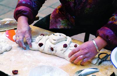 面羊既有报恩孝亲之意,还被应用到人生礼仪当中,具有了“佑命符”的象征。上党地区,孩子过满月,姥姥、舅舅家要送五只大小不同的面羊,取“伍”谐音,表示与羊为伍。其中大羊戴锁,并挂红线串绕三枚古钱,旁置“拴羊石”,意思是把孩子拴住了。12岁开锁时,姥姥家要送12只面羊,取意天干地支12年轮。开锁仪式后,孩子拿着一只面羊,找邻居家换一把盐,表示从此可以独自体味人生。此俗在寿阳、霍州等地,演变为面圐囵上捏上12只羊,戴在小孩脖子上开锁,称“面羊羊”或“羊羔馍”。到晋南、晋北其它地方,又演变为面圐囵上捏12种属相动物,也有的捏成龙凤。
