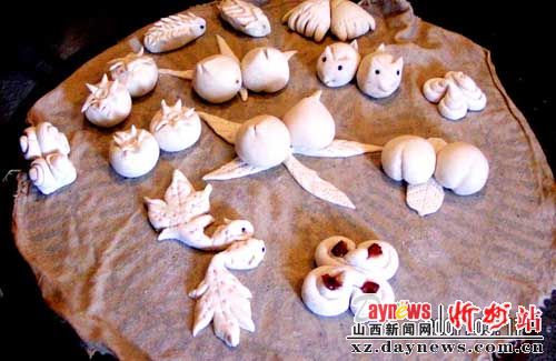 面羊在中元节也朝多样化发展,各种花鸟鱼虫面制品竞相而出,尤以面鱼与面人为代表。羊属阳,鱼属阴,因此晋北民间此日面羊给男娃,面鱼给女娃,还有制双羊共头或羊头鱼尾,喻阴阳相交,若三只摆放,喻“三阳开泰”,祝娃娃茁壮成长。而面人以山西定襄制作得最为奇特,其中有一道四喜娃,是几个小胖娃娃腿臂交缠嬉戏,造型饱满,构思精绝,令人惊叹不已。