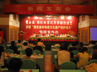 到清代,《名食掌故》记山西有名的月饼,一个是古县的八珍月饼,因用八种馅料制成而名。一个是郭杜林月饼,相传还有一个歪打正着的起源故事。清初太原城一家糕点铺,有姓郭、杜、林的三位师傅,喝酒误了时辰,饼面已发酵。师傅们往发酵的面团中掺和生面,并加碱面与油糖做成一种包馅饼,称“三糖饼”,上市后广受百姓欢迎,人们称其为“郭杜林”月饼。其技艺后来不断改进成熟,现已成为太原市的国家非物质文化遗产。第三个是乡间的“笨月饼”。在山西乡野民间,制作月饼称“打月饼”,生动表述了月饼模子压、扣之工序。供月神,晋中制作的月饼为四个一套,称“套月饼”,而晋南多制一个特大月饼,祭后分食谓之“团圆”,若有未归者,还要留出一块。在晋北繁峙,月饼成球形,风俗甚异。