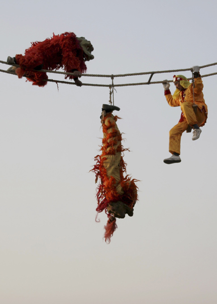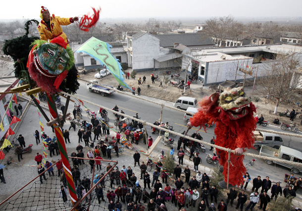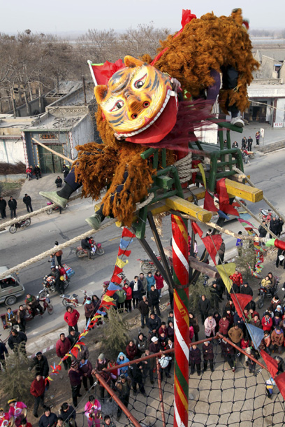 “空中高台”是山西永济市虞乡镇一项有上百年历史的民俗表演,曾一度失传20年。如今村民们将这一民间艺术重新挖掘出来加以传承,以丰富农村群众的节日文化生活,以下图片是山西省永济市虞乡镇土乐村村民表演“空中高台”狮虎闹春,迎接虎年到来。 ■