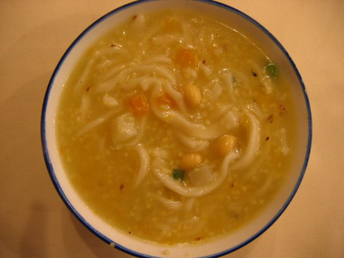 具体做法:锅里盛清水置旺火上烧开,先放入豆类、小米、略煮一阵,再加入易煮的蔬菜,熬熟后,投入细细的白面条或三和面条,沸熟后,放盐,定好口味起锅。另用饭勺将食油在火上加热,将葱花或蒜片炸出香味,点醋成汁,烹入