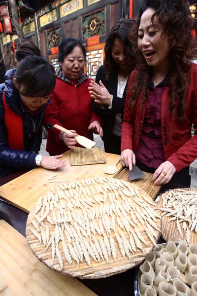 2011年2月15日,山西平遥古城内的程家老院一家人在制作传统山西面食