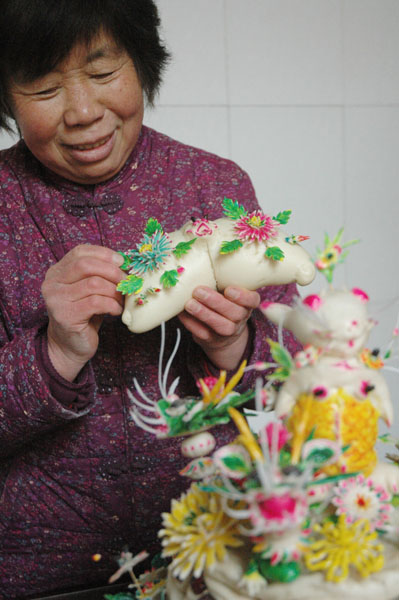 65岁的面塑艺人董巧兰在修饰她创作的两个直径为45厘米、高50厘米、重15公斤的大花馍