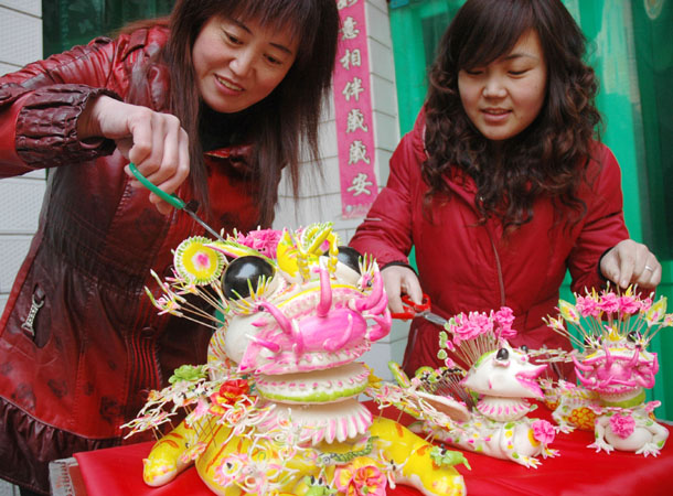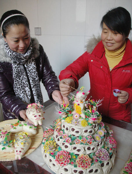 山西省闻喜县面塑艺人刘红菊(左)和弟子在修饰准备参赛的花糕