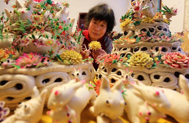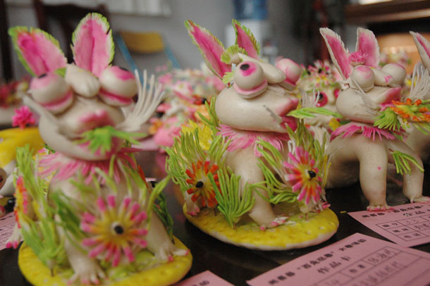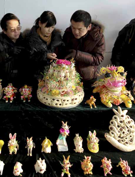 2011年1月17日,山西省闻喜县举办“百兔迎春”花馍大赛,参赛的百余件生肖兔花馍作品,构思巧妙、造型各异、栩栩如生,吸引市民前来观赏。新华社薛玉斌摄