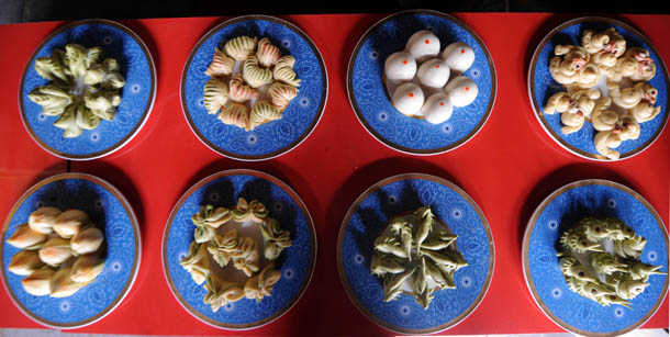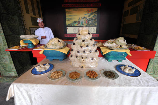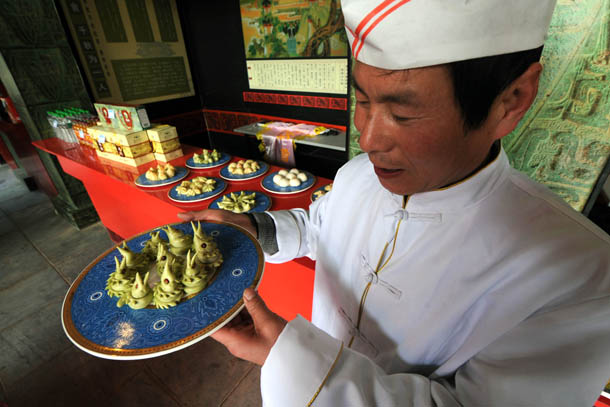 2011年3月31日,介公山庄的厨师长曹述昌正在展示他制作的寒食面点