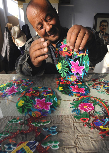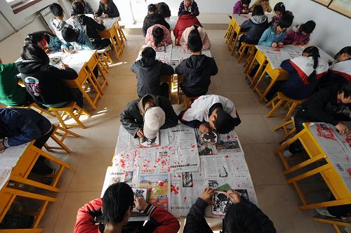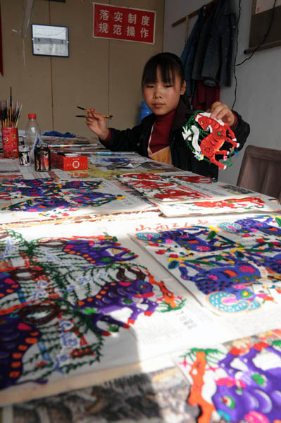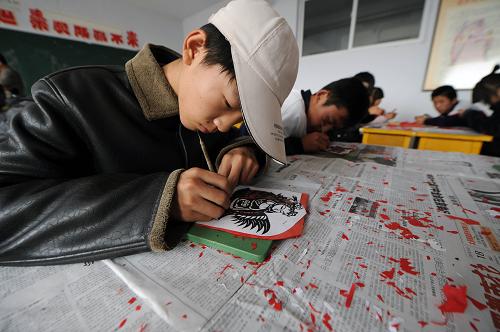 新华社太原11月2日电(记者陈忠华 王菲菲)左手握着红纸,右手拿着剪刀,李海媛神情专注。咔嚓咔嚓,剪刀在她的手中弯曲自然,运转灵活。一会儿工夫,红纸屑落满了课桌,一只栩栩如生的小兔子跃然眼前。 “我最喜欢上剪纸课。看着一张纸在自己手中变成各种各样的图案,特别有成就感。”刚刚升入蕉山中学初一年级的李海媛学习剪纸不到半年,兴趣却越来越浓,技艺也突飞猛进。“这孩子能坐得住,是个学剪纸的好苗子。”在旁指导的王兴利老师不住地称赞。王兴利是当地有名的剪纸艺人,也是蕉山中学特聘的剪纸老师。 蕉山中学位于山西省广灵县蕉山乡。这里是中国民间剪纸三大流派之一——广灵剪纸的发源地。为传承剪纸艺术,广灵县将剪纸列入了当地三所初中、职校的必修课中。蕉山中学是最早开设剪纸班的,从2001年至今,培养学生近千名。“开设剪纸课,对孩子们来说,既传承中国传统文化,也是艺术熏陶和培养。”王兴利说。 广灵剪纸俗称“窗花”,由民间刺绣工艺演变而来,形成于明代,在清朝道光年间趋于成熟。其后,经过不断改进,广灵剪纸形成独特的艺术风格,2009年入选世界非物质文化遗产名录。 “广灵剪纸,有剪的,但更多是用专门的刀具来刻。这就是它的独特之处,一幅剪纸作品,要经过设计、刻制、染色等多道工序。”王兴利说,按照这些工序,学校课程安排也循序渐进:初一学习用剪,初二学习刀刻,初三学习点染,每周每班三节课。 从好奇好玩到渐入佳境,王兴利培养出的学生在各类剪纸比赛中多次获奖。