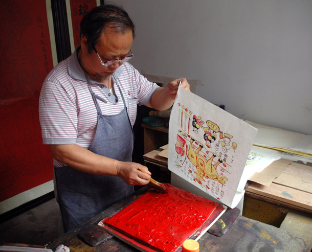 新华社太原10月11日专电(记者王飞航)“我从小就喜欢木版年画,喜欢它厚重的色彩和古朴的线条;后来四处收购搜寻,近二十年里共收集了各个时期的老木版500多块,老年画600多张。”山西新绛县民间艺人吴百锁说。 山西绛州木版年画历史悠久,发端于宋金,兴盛于明清,较杨柳青、朱仙镇、桃花坞年画问世均早,最早见于北宋《佛说北斗七星经》之雕版插图。随着时代的变迁,绛州木版年画逐渐进入了衰落期,原有的作坊均已停产歇业,老版也散失民间,这一传统技艺面临失传的局面。 山西新绛县文化局退休干部吴百锁看到木版年画这一历史文化遗产遭到破坏,十分心痛,下决心挽救这一文化瑰宝。 怀着对木版年画的痴迷,吴百锁先后投资近200万,坚持数十年搜集、整理、保护老版、老画稿、老画卷,他曾多次走访版画老艺人,学习版画制作技艺,致力于保护和抢救绛州木版年画这一珍贵民间文化遗产。“木版年画是中国民间艺术中一笔巨大的遗产,它最清晰地描绘出农耕时代人们的精神天地,最炽烈地展示了老百姓的心灵向往,最缤纷地表达了那个漫长的历史时代社会生活的全貌。越是深入了解这种文化,越是被它的历史感和形式美所吸引。”吴百锁说。 2007年,吴百锁创建成立了绛州木版年画研制所,专门从事绛州木版年画的收集、整理、研究、创作工作。截至目前,吴百锁已收藏各个时期的古版500余块、老画600余幅,最早的可以追溯到明代,其中有46版、画被录入《中国木版年画集成·绛州卷》一书中;他制作完成的最小的绛州木版年画比拇指还小,最大的《福禄寿三星》作品长宽近2米。 2008年初,中国民间文艺家协会主席冯骥才在新绛县考察绛州木版年画后认为,绛州木版年画品种繁多,手法齐全,雕版技术精湛、线条细腻,年画内容所能体现的历史脉络清晰,是一项完整的民间文化遗产。“绛州木版年画现已列入山西省非物质文化遗产,正申报国家非物质文化遗产,政府对这一块非常重视,我自己的木版年画研制所在传承绛州木板年画的同时,也已培养了十余名传承人,我们有信心使绛州木版年画这一民间奇葩重新焕发生机。”吴百锁说。
