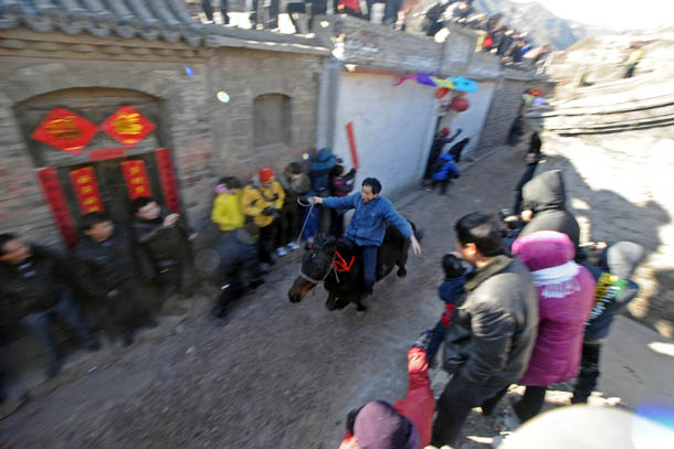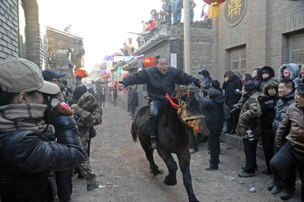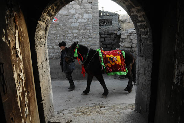 2012年2月7日,山西平定县下董寨村的一位村民骑着马从村里的巷道中驰骋而过 |