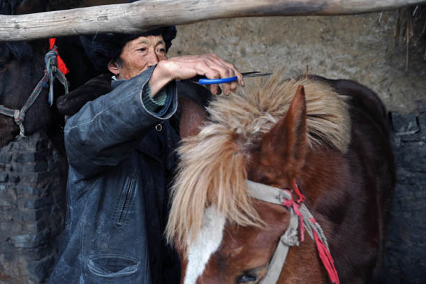 村民董城相在为马剪鬃毛,准备参加跑马 |