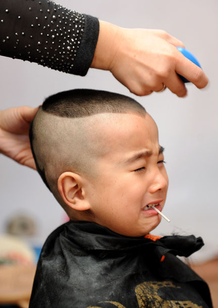 2012年2月23日,在山西省临汾市区一家儿童理发店,理发师在为孩子“剃龙头”