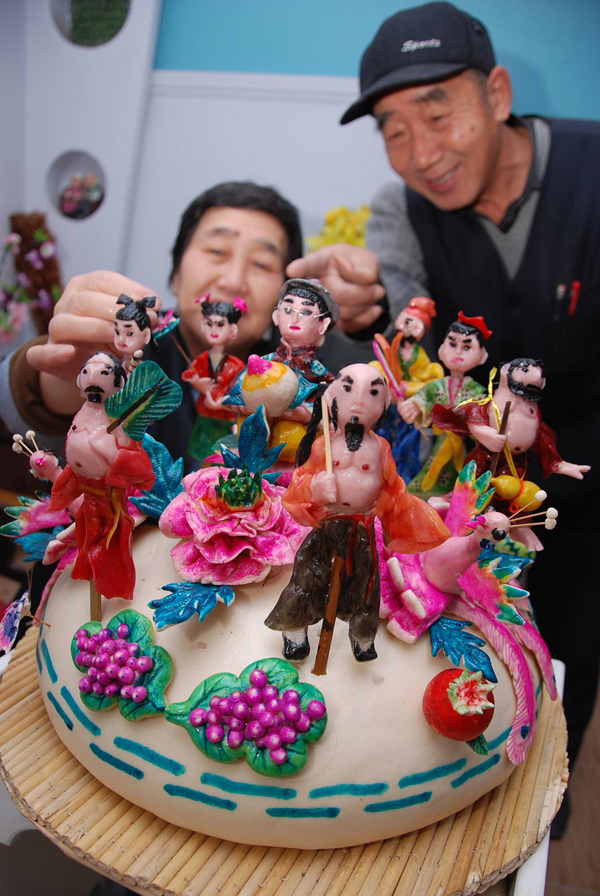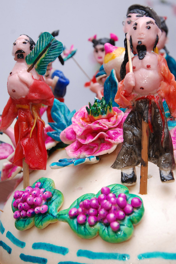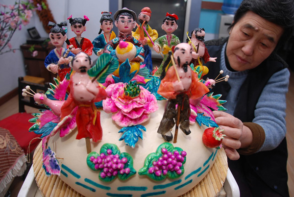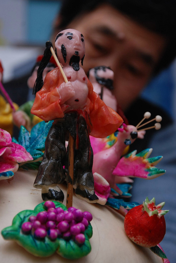 2009年12月21日,山西运城新绛县面塑传承人王文华在精心制作“八仙庆寿”面塑寿桃