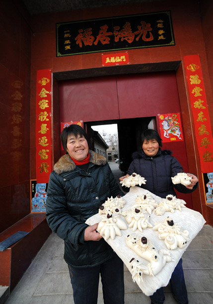 2012年1月27日,芮城县东历山村村民任莲凤(左)按照习俗将刚出锅的芮城花馍送给邻居