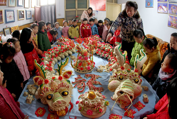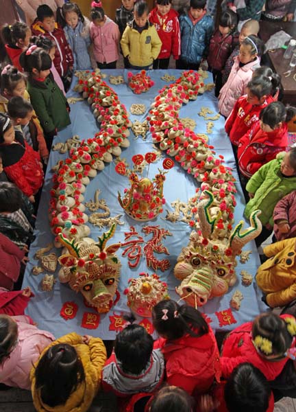 12月27日,山西省万荣县城镇幼儿园的孩子们在观赏面塑“巨龙”。