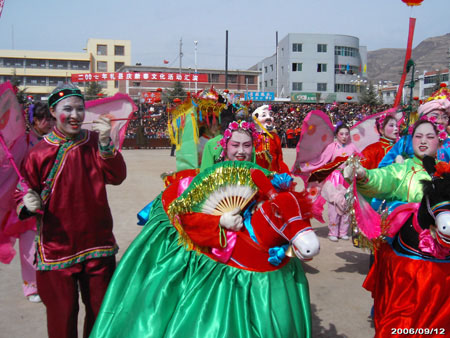 跑竹马的表演形式简便,动作也比较简单,跑动时,以走场为主,有“双进门”、“四门斗”、“水溜溜”、“绕八字”、“蛇脱皮”、“十字靠”、“剪子股”、“跑圆场”、“二龙出水”、“南瓜蔓”等十余种场图,表演时,伴奏乐器大多使用锣、鼓、镲等打击乐器,也有的地方用唢呐吹奏民间乐曲的。 |