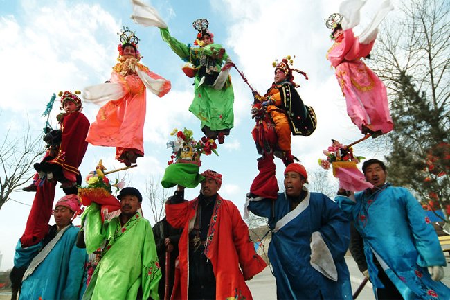 有的演员,单脚踩一只花瓶,随着铁棍的悠扬起伏,加上木杠弹性的惯力,很快就会使三个女孩子悠悠扬扬地摇摆起来。内行的民间艺人,抬起社子,两三步就要使女孩子们飘动摇摆,让观众满目生情。
