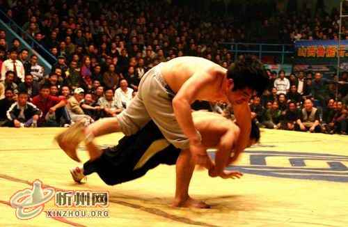 相传,北宋以前,忻州一带的人们也喜欢摔跤,但那时的摔跤仅限于一般的娱乐活动。到了南宋,著名的民族英雄、抗金将领岳飞被害以后,岳飞的部下,一位忻州籍的老兵回到故乡。这位老兵念念不忘抗金的大志,便在村中把军中所学的带有武术色彩的拳脚、摔跤技艺传授给了当地的乡亲,由于当时的历史条件所致,演武之风盛行,以此作抵抗金兵的本领,而且是自己防身之术,久而久之,便沿袭成为当地民间传统的风俗流传下来。当年的忻州水草丰茂,养羊甚多,更由于这几方面的条件而发展成为“挠羊赛”,而且兴旺起来。