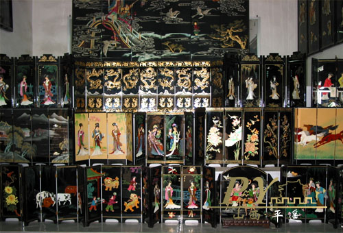据记载,平遥制作推光漆器始于唐代开元年间,具有悠久的历史。现有品种多为高档屏风、挂屏、电视柜、大小衣柜、角柜、酒柜、陈列柜、首饰匣等。底漆多以墨黑、霞红、杏黄、绿紫为主,上面绘以具有民族风格的图案,如古典小说、戏剧中的故事人物、古代神话、传说中的故事人物等等,或描金彩绘,或刀刻雕垫,或堆鼓镶嵌,线条流畅,色调和谐,富丽堂皇。