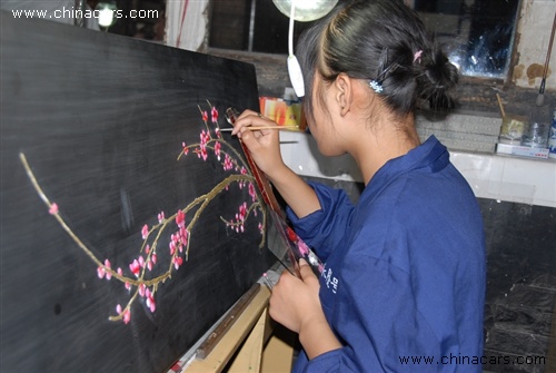 平遥推光漆器的生产,分木胎、灰胎、漆工、画工和镶嵌等五道工序。木胎车间使用松木做出各种家具的木胎后,灰胎车间就用白麻缠裹木胎,抹上一层用猪血调成的砖灰泥,这叫做“披麻挂灰”。漆工车间的工序是非常细致和复杂的。在灰胎上每刷一道漆,都要先用水砂纸蘸水擦拭,擦拭毕,再思手反复推擦,直到手感光滑,再进行刷漆,多则刷七退,少则刷六遍,其后的推擦就更细致了。先用粗水砂纸推,再用细水砂纸推,用棉布推,丝绢报,卷起一缕人发推,手蘸麻油推,手蘸豆油推,掌心反复推。凭眼力,凭心细,凭感觉,凭次数,推得漆面生辉,光洁照人。画工和镶嵌车间,对技术的要求更高,画工必须学习绘画四年以上,掌握了绘画的基本技巧,才允许在漆面上勾红点翠,独立操作。刻绘工人的刀锋,要求象笔锋一样,粗细相间,深浅适度,起落自如。镶嵌原件的制作台上,团团烟光紫气,叮叮有声,工人们把河蚌壳、螺钿、象牙以及彩色石头加工成各种原件,由镶嵌工人根据图案的要求.巧妙地镶妥粘牢。