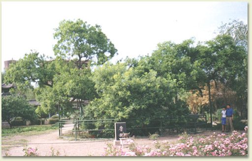 691)位至宰相,封梁国公,太原市唯一一条以人命名的街道就叫狄梁公街。狄村旧有狄梁公祠,祠旁有一槐树,相传为狄仁杰母亲所植,乡人爱护,至今老槐岿然,新枝茂密。太原市于1996年在狄村街修建了唐槐公园,树有狄公故里碑和唐槐碑。(上图为唐槐背面,下图为唐槐正面) |